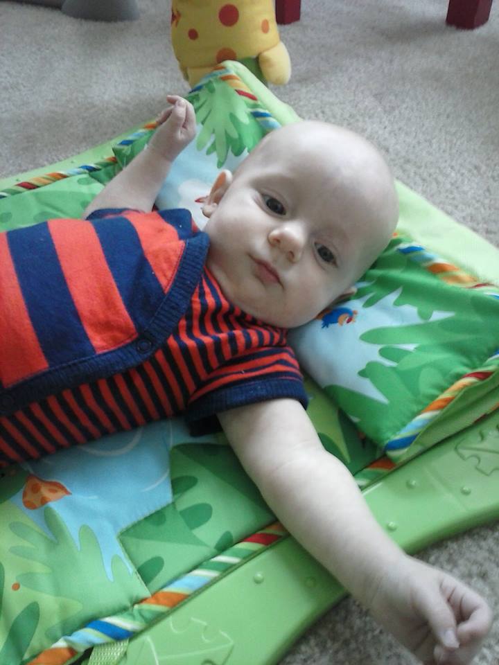 Nicholas is 4 months old (and 3 days). I am a couple days behind because 1) I wanted to wait for growth stats from the doctor; 2) he was fussy from shots so I was waiting for happy Nicholas to return, and 3)I ran out of time on Saturday. But here is what's happening for Nicholas at 4 months.